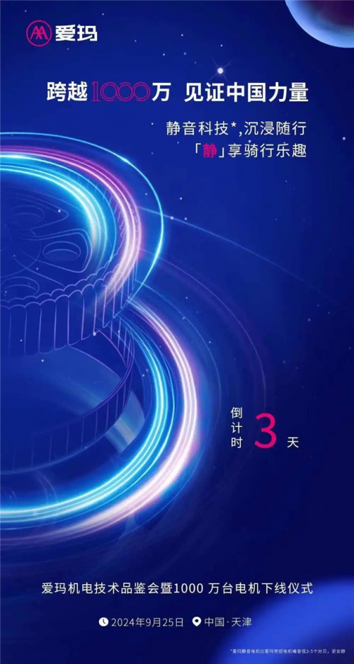 9月25日,愛瑪機電將在天津基地舉辦“跨越1000萬,見證中國力量”愛瑪機電技術品鑒會暨1000萬臺電機下線儀式。這樣的重磅消息,瞬間吸引了行業內外的廣泛關注。
