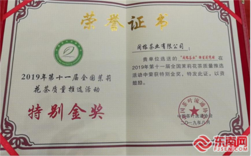 2019年,閩榕茶業(yè)有限公司選送的“茉莉繡球”福州茉莉花茶產(chǎn)品以95.15分成績獲得第一名,摘得“特別金獎”稱號。