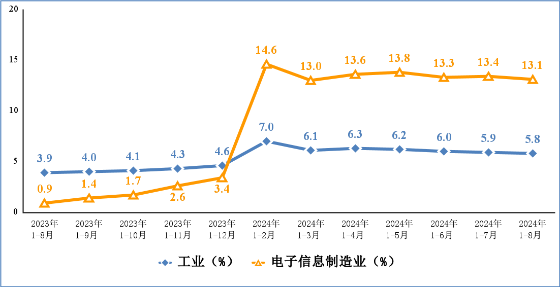 1-8月,規(guī)模以上電子信息制造業(yè)增加值同比增長13.1%,增速分別比同期工業(yè)、高技術(shù)制造業(yè)高7.3個和4.2個百分點。8月份,規(guī)模以上電子信息制造業(yè)增加值同比增長11.3%。