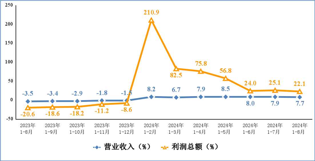1-8月,規(guī)模以上電子信息制造業(yè)實現(xiàn)營業(yè)收入9.94萬億元,同比增長7.7%,較1-7月回落0.2個百分點;營業(yè)成本8.68萬億元,同比增長7.4%;實現(xiàn)利潤總額3928億元,同比增長22.1%;營業(yè)收入利潤率為4.0%,較1-7月提高0.1個百分點。8月份,規(guī)模以上電子信息制造業(yè)營業(yè)收入1.32萬億元,同比增長6.2%。