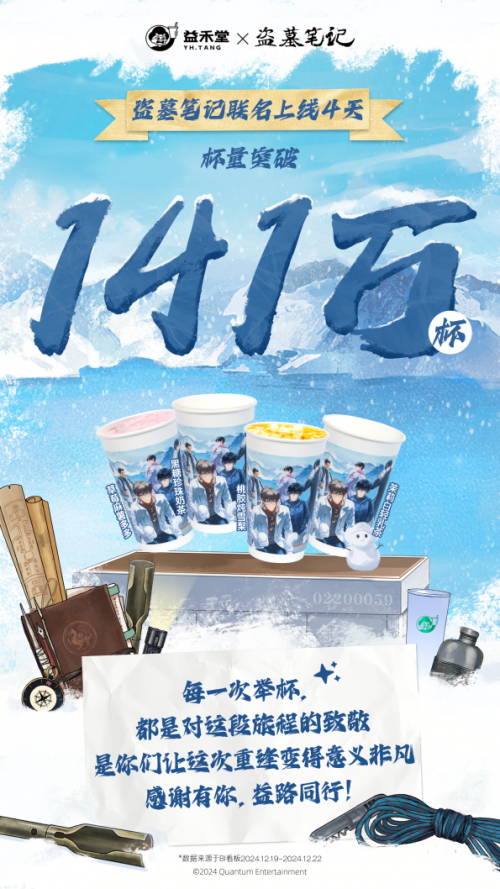 近日,益禾堂與《盜墓筆記》的聯(lián)名活動在全國范圍內(nèi)掀起了一股熱潮,各大主題門店紛紛迎來了爆單盛況,銷售數(shù)據(jù)一路飆升,聯(lián)名上線4天,杯量突破141萬杯,小紅書有關(guān)聯(lián)名筆記超4000+,微博閱讀量超2300萬,其中,12月20日,微博單日閱讀量破1700萬+。此次跨界合作不僅吸引了雙方的忠實粉絲,更激發(fā)了廣大消費者的濃厚興趣,成為這個冬日里最耀眼的明星。