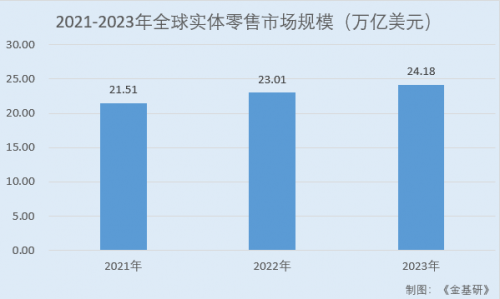 據eMarketer數據,2021-2023年,全球實體零售業市場規模分別為21.51萬億美元、23.01萬億美元、24.18萬億美元。隨著經濟生活常態化,未來全球實體零售業市場規模增幅將逐步恢復平穩,eMarketer預計2023-2027年間復合增長率約3%。