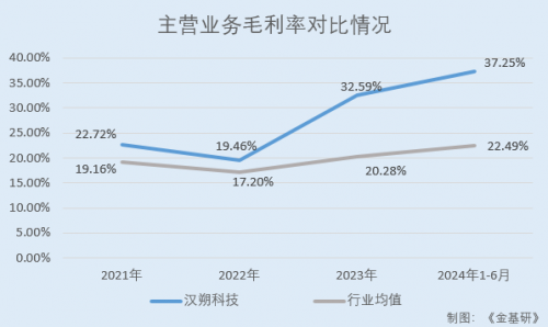 2021-2023年及2024年1-6月,漢朔科技的主營業務毛利率分別為22.72%、19.46%、32.59%、37.25%,高于行業均值。