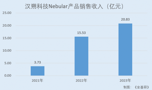 2020年,漢朔科技成功推出的新一代電子價簽Nebular獲得市場客戶的廣泛認可。2020-2023 年,漢朔科技Nebular產品銷售收入分別為0.10億元、3.73億元、15.53億元、20.83億元,年均復合增長率達到487.21%,占主營業務收入比例從0.95%增長至55.18%。