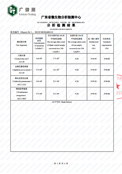 根據JC/T 2039-2010《抗菌防霉木質裝飾板》,經檢測,大腸桿菌、金黃色葡萄球菌、銅綠假單胞菌、肺炎克雷伯氏菌抗細菌率≥99.99%。