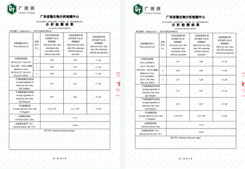 根據ISO 21702-2019 《塑料和其他非多孔表面抗病毒活性的測定》,經檢測,甲型流感病毒H1N1和H3N2的抗病毒活性率>99.9%。