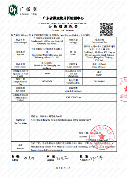 鋅效抗菌石墨烯系列產品在紙張浸膠過程添加專用防霉材料,同霉菌中的蛋白質反應,抑制其生長,飾面之后的板材擁有一層強力的防霉保護層,成品板材達最高等級0級防霉,保護家居美觀與耐用性、同時保障家人健康。
