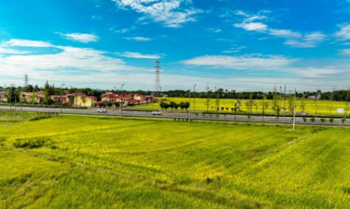 夏季的港城大道,兩側麥浪翻涌,農舍點綴其間,杏黃墻面與絳紅坡頂,在綠蔭掩映下跳脫出川西林盤的詩意。