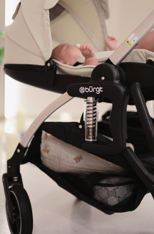 2. 避震與穩(wěn)定性:配備高性能避震系統(tǒng),一般采用減震輪胎結(jié)合車架避震結(jié)構(gòu),較少高端推車采用科學(xué)的液壓避震器結(jié)合多連桿懸掛車架避震結(jié)構(gòu)。減震輪胎已經(jīng)是嬰兒車標配了,但液壓避震器應(yīng)用的比較少,避震器能有效緩沖路面顛簸,如遇到石子路或減速帶,可大大消耗震動,保障寶寶的舒適度。車架部分在關(guān)鍵連接處使用彈性材料或多連桿懸掛裝置,進一步提升避震效果,保障寶寶乘坐平穩(wěn)。