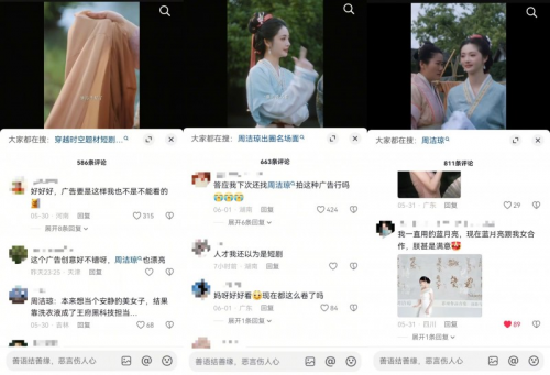 頗具創(chuàng)意的內(nèi)容設(shè)計,也受到了諸多消費者的喜好,大量消費者自發(fā)分享轉(zhuǎn)發(fā)視頻。僅品牌官號的微短劇總點贊量便超10萬,播放量破千萬。同時衍生出眾多抖音熱點,如#周潔瓊古裝清冷感拿捏了 #周潔瓊眼神戲的靈動感等,話題最高累播放量超1.1億次(6月17日數(shù)據(jù))。