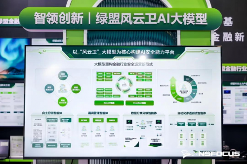 在本次展會上,綠盟科技展示了安全大模型和大模型安全技術在金融領域的創新與實踐。綠盟風云衛 AI 安全大模型融合先進的人工智能技術,賦能安全運營、數據安全、安全監測、藍軍能力,能夠對金融行業面臨的復雜多變的網絡安全威脅進行智能感知、降噪分診、分析和響應,為金融機構提供更高效、精準的安全防護。