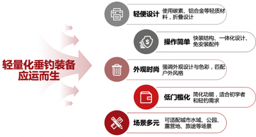 根據《輕量化垂釣白皮書》數據顯示,中國已有超過1.6億的垂釣人群,且近些年在不斷增長。而隨著時代及人們生活方式的變化,傳統垂釣裝備在實際使用中逐漸暴露出諸如體積龐大、重量偏重、搬運不便、組裝復雜等痛點,難以滿足釣魚人群短時高頻、即興出行的戶外使用需求。基于此,輕量化垂釣裝備應運而生。