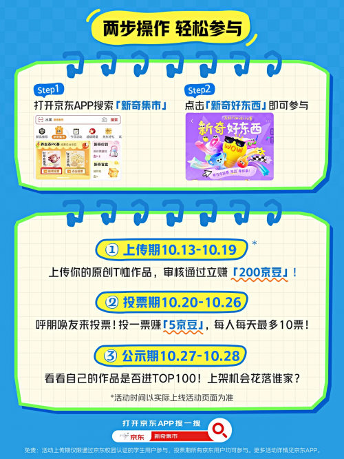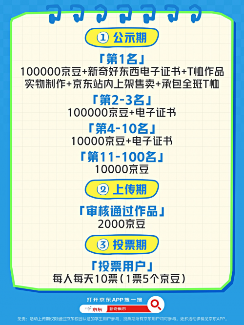 此次大賽參賽對象為全國高等院校學生,需通過京東校園學生認證方可參與。活動時間則分為三個階段,作品上傳期為10月13日至10月19日,其間,學生認證用戶需上傳原創設計作品;作品投票期為10月20日至10月26日,所有用戶可參與投票并賺取京豆;10月27日至10月28日則為結果公示期,屆時將公布前100名獲獎名單。