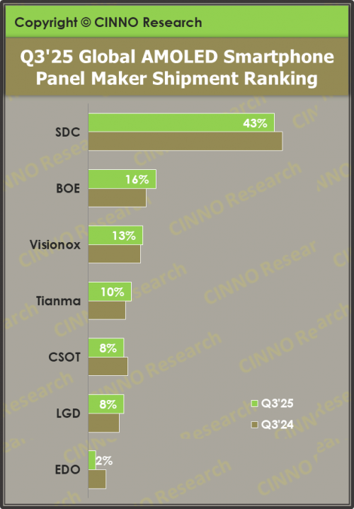 根據CINNO Research統計數據顯示,2025年第三季度全球AMOLED智能手機面板出貨量約2.5億片,同比增長11.7%,環比增長20.3%,實現同比與環比雙增長,市場景氣度持續回升。國內面板廠商維信諾(002387)三季度出貨量同比增長16.7%,出貨量排名位居全球第三。