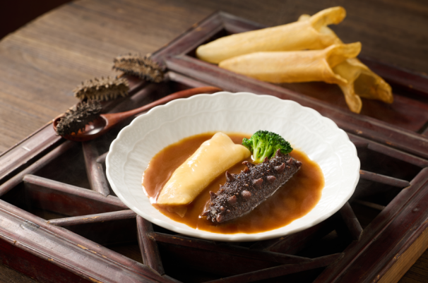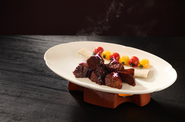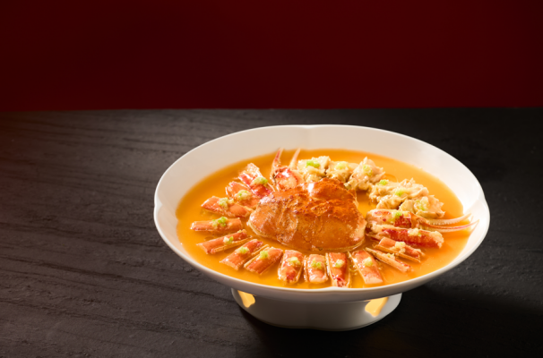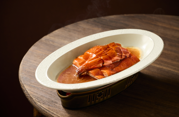 祥云繞富宴:專為溫馨小家庭設計的4人套餐,精選八道寓意菜式,兼顧經典與巧思。開場以“喜獲天賜”(嶺南風味雙彩碟)開啟味蕾,湯品“大吉大利”(鐵皮石斛燉走地雞)溫潤滋養。主菜陣容中,“紅紅火火”(深井脆皮燒鵝)色澤金紅,皮脆肉嫩;“招財進寶”(XO醬蘆筍百合燒蝦球)鮮爽彈牙;而“雙輝呈祥”(蠔皇扣雙寶)則奉上海參與鮑魚的豐腴美味。壓軸的“年年有余”(年糕燒黃魚)與“發財就手”(鮑汁發財豬手),更是將“年年高升”、“招財進寶”的新春祝福融入佳肴之中,配以手工水餃與時令鮮果,團圓美滿,恰到好處。