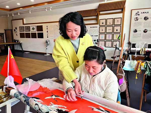 初冬時節,記者來到揚州,走進國鳳刺繡廠展示廳,只見十四屆全國人大代表、江蘇省揚州市寶應縣國鳳刺繡廠技術總監莫元花,正在為繡娘指導針法。